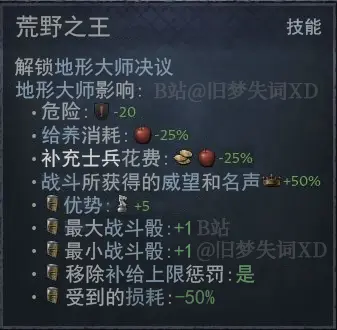 考虑到该设定不好适配无地角色,因此我们尝试用一个万金油的效果来代替,因此全面提高了给养和旅行速度加成。