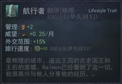 与驴友特质有所不同的是,我们希望该特质能减少与其所属技能树的协调,反而希望制作为一个内容相对综合的特质。该特质不仅还提高了15%的外交范围,还提高了旅行速度,以此鼓励玩家前往以前够不到的地方。