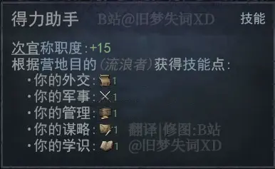 该特质的第二部分是我的尝试,看看玩家根据当前营地宗旨获得技能加成是否有趣,这一点略微受到了其他特质的启发,如外交-顾家之人线中的“从善于友”或学识-学者树中的“用以致学”。正如你所想象的那样,具体的技能会根据你的营地宗旨而改变,例如雇佣兵的军事和勇武,或者学者的学识和管理。
