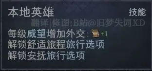 对于驴友生活树而言,我们将前置于特质的两个技能点都做的较为重要,本地英雄能将威望等级转化为外交数值加成。