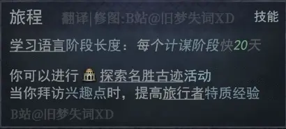 作为第一个中间技能点,将会解锁探索名胜古迹活动。该活动十分给力,甚至都不需要增加额外的加成。这也是本技能树,第一个围绕语言提供加成的技能点。