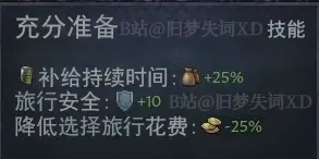 开门直接送大家旅途安全。如果玩家想常年在外奔波,那么这个技能点就提供了最重要的补给、旅行安全和花费等基础加成。