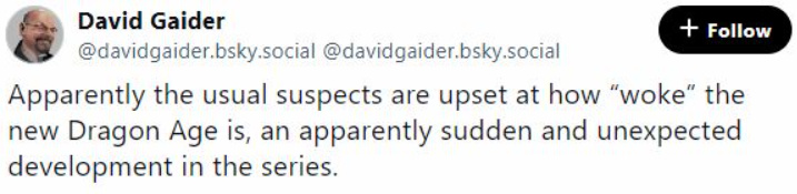 David 表示,对《龙腾世纪 4:影障守护者》的“政治正确”批评是基于无知的,并给那些传播此类观点的人士贴上了“路人”或“游客”的标签。他进一步澄清说,对于人们对《龙腾世纪》内容的喜好,他没有任何意见,他的观点是在反驳那些认为《影障守护者》更加“正确”的观点。
