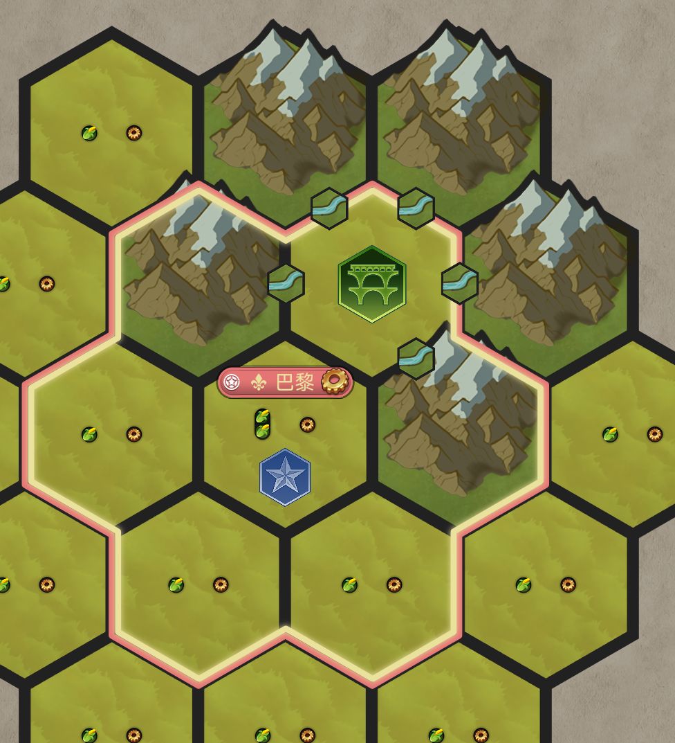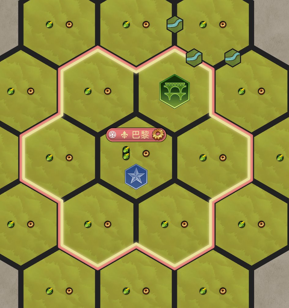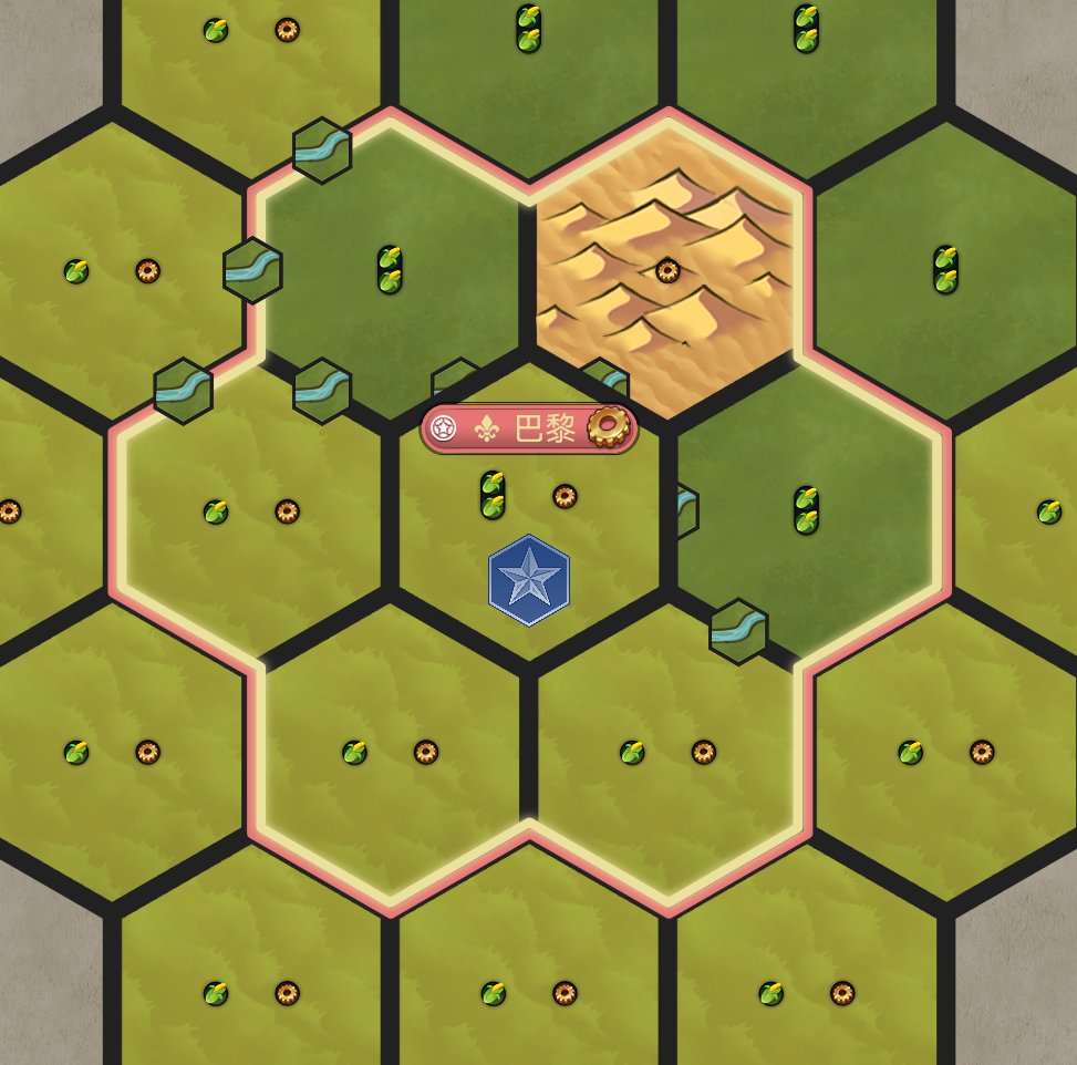 第二点我再详细的解释一下,文明6的地块呈正六边形,水渠与市中心相邻则消耗一条边,这一条边直接忽略,它与水渠修建的第二个条件无关。