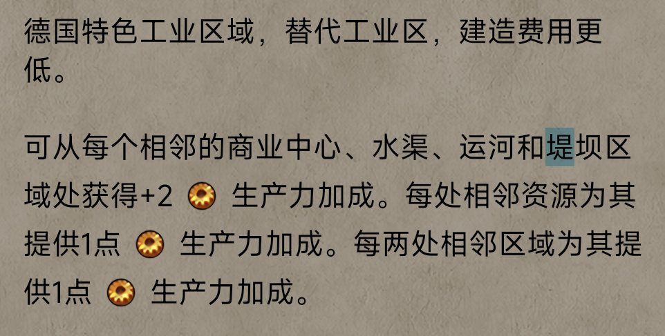 众所周知,工业生产需要大量的水,因此游戏中能运输水源的区域如【水渠】、【运河】以及【堤坝】等会给【工业区】产生额外的+2大量相邻加成。再加上上述三个区域自带的+0.5小量加成,因此给予【工业区】共+2.5相邻。