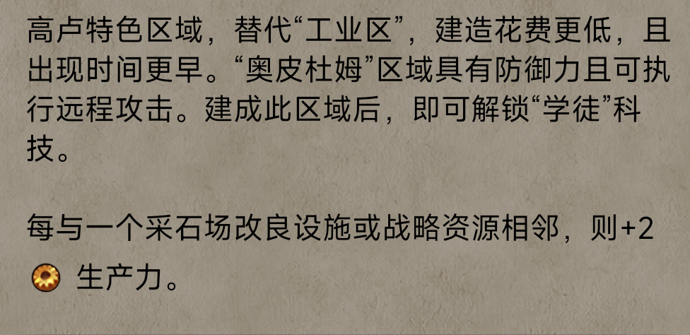 【高卢】:高卢拥有半价工业区的同时,工业区解锁的相对更早,并且,高卢自带丘陵地形关联,能在丘陵上获得更多的加成。然而,高卢的工业区只吃【市政中心】和【资源改良】的相邻,因此,水渠对于高卢工业而言,没有任何价值。