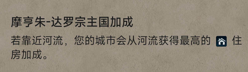 【河流】:提供淡水资源,城市+2住房,可沿河修建水渠,增加+4住房;