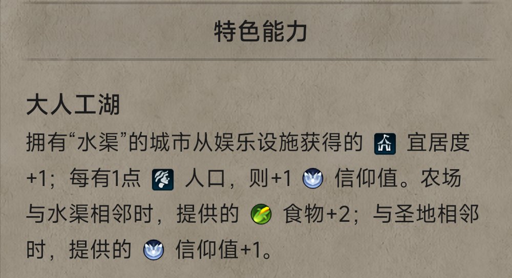 水渠的作用很简单,总共就只有五点:①为城市提供额外的住房;②为其他区域提供+0.5的相邻小量加成;③为【工业区】提供+2的相邻大量加成;④为帝国科技线提供“中世纪-军事工程学”的ulk;⑤为特殊文明领袖提供额外的其他加成。