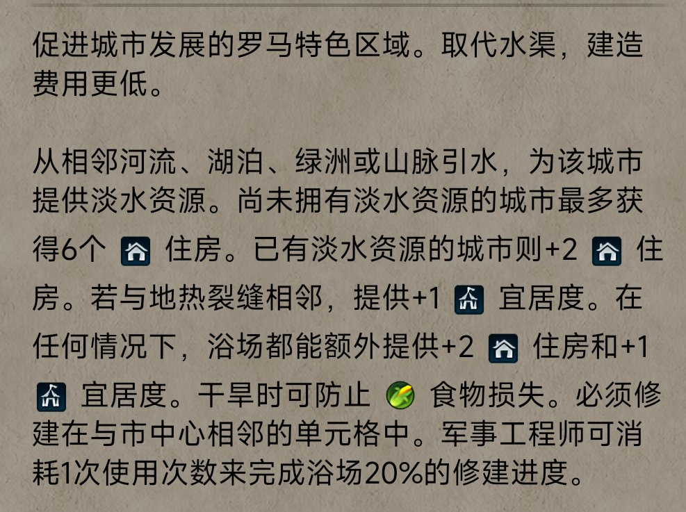 【罗马】:作为没事就洗澡的文明来说,水渠已经蜕变成了澡堂,【浴场】即半价水渠,拥有修建即增加+1宜居度的强大效果,所以,每个澡堂通罗马也不是说不通的。