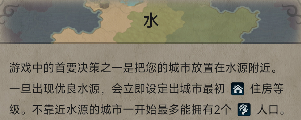 城市靠近水源,则会获得额外住房,如城市没有水源,则住房为默认的+2住房。游戏中的水源包括:海洋、河流、湖泊、绿洲以及山脉。