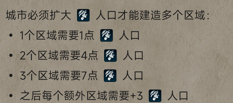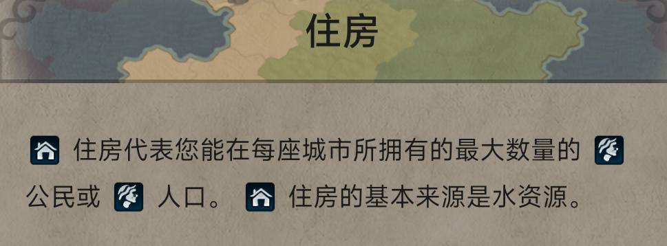 【住房】:为城市人口提供正常的容纳空间。在剩余粮食一定时,如住房紧张(人口≤住房),则会降低人口增长速度;如人口超标(人口>住房),则会在紧张情况拥有debuff的情况下,增加降低城市宜居度的debuff。