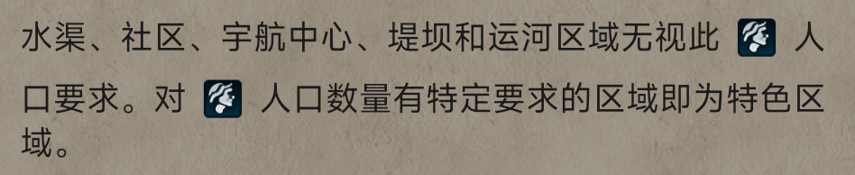 【普通区域】:特指那些没有人口数量限制的区域。包括除水渠外,还有运河、堤坝、社区以及宇航中心等均属于普通区域。