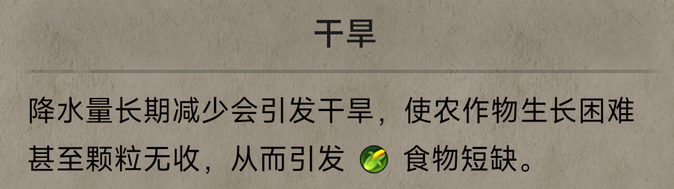 【干旱】:自然灾害中的一种。随机发生在缺水或无水的单元格,发生时呈块状分布,受灾区的地块粮食产出会大幅减产,同时摧毁受灾区所有改良,并一定回合中无法修复。
