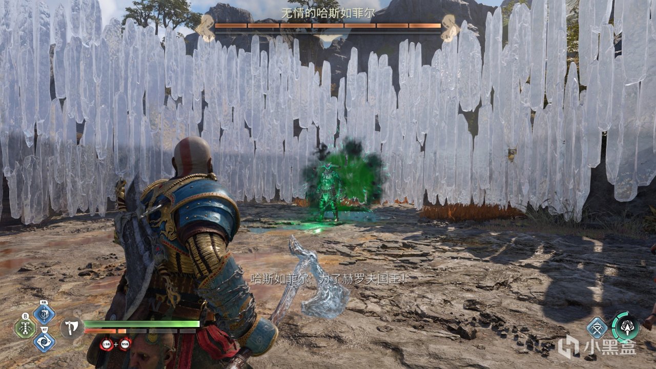 斧和刃则是大家的老朋友了,《战神:诸神黄昏》中一开始就可以直接使用,一把冰霜一把火焰,一手近距离大开大合输出,一手中距离覆盖较大范围战场,搭配跳跃、奔跑、前后翻滚、停滞、瞄准、符文等能演化出各种不一样的连招和变招,当敌人身上已经挂上了冰火其中一个状态,使用另一把武器输出还能造成额外伤害。