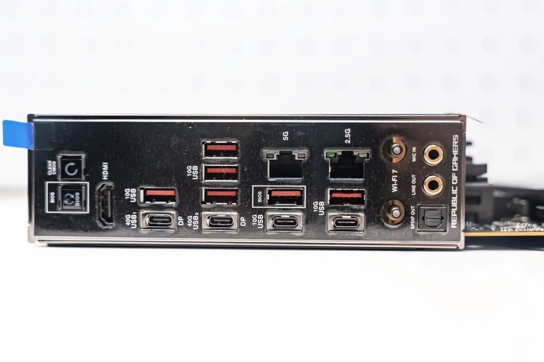 ROG X870HERO主板提供了豐富的I/O接口,後置面板除了BIOS FlashBack™ 按鈕(無CPU情況下刷新BIOS)、Clear CMOS 按鈕(清除CMOS設置)外還提供了1個HDMI2.1接口(4K@60Hz)、2個USB4接口(40Gbps、4K@60Hz) 、6個USB-A+2個USB-C接口(10Gbps)、1個Intel® 2.5Gb有線網卡+1個Realtek 5Gb有線網卡、WiFi 7天線插口(支持天線直插)、 2個鍍金音頻插孔(LINE OUT / MIC IN)、1個S/PDIF 光纖數字音頻接針。