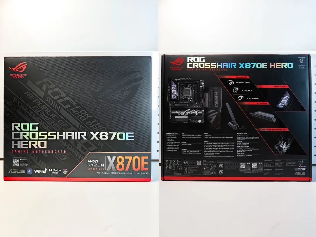 爲了讓新款處理器的性能發揮到極致,AMD對應推出了新系列芯片組,目前最頂級的就是X870E,各大廠商也紛紛跟進,其中就有大家熟知的華碩ROG,我用來搭配銳龍9 9900X的主板便是上市不久的ROG CROSSHAIR X870E Hero,簡稱ROG X870 Hero。
