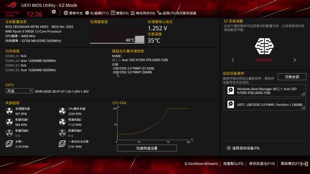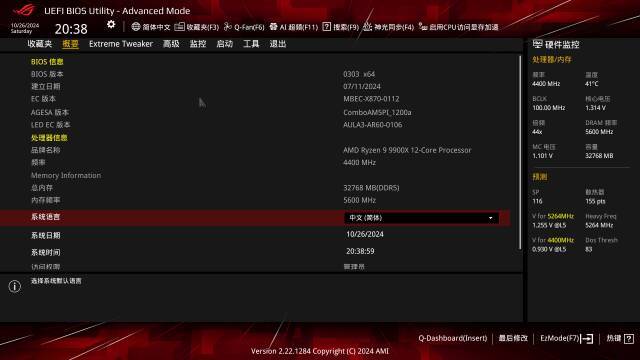 作爲主流廠商,華碩主板BIOS的界面設計可以說是非常直觀清晰易上手了,首次進入BIOS可以在概要界面將英文切換成中文,整個界面的配色還是熟悉的ROG味道。