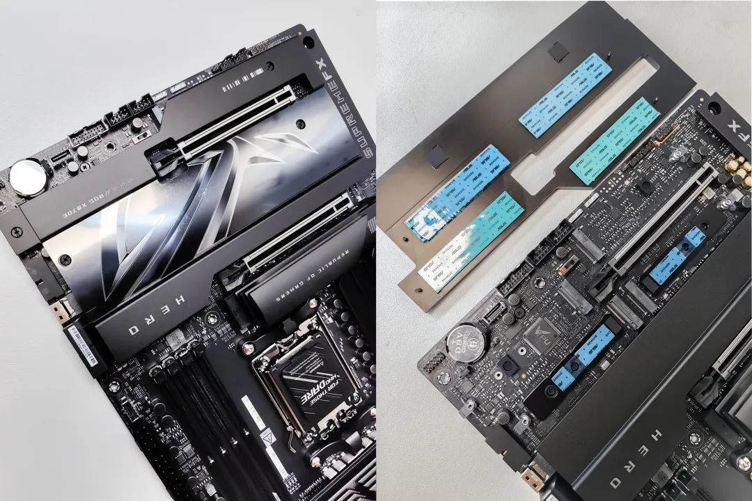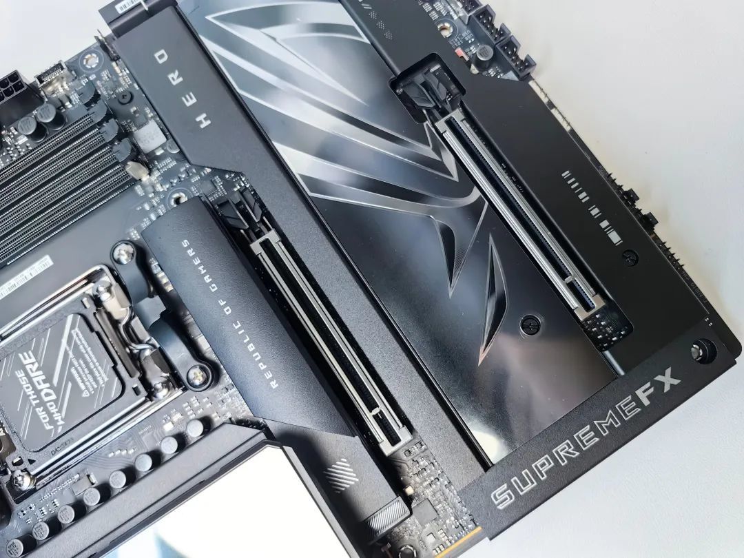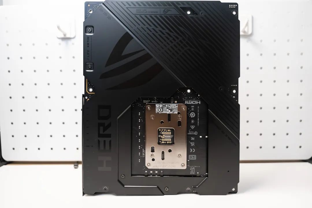 此外,正面也可看到CROSSHAIR、SUPREMEFX、HRRO等字樣,辨識度非常高。相對來說ROG X870HERO背面要比正面樸素一點,不過依舊保留了ROG的設計語言,並且增進了主板剛度和散熱效能,可以看出金屬背板的工藝非常精緻。