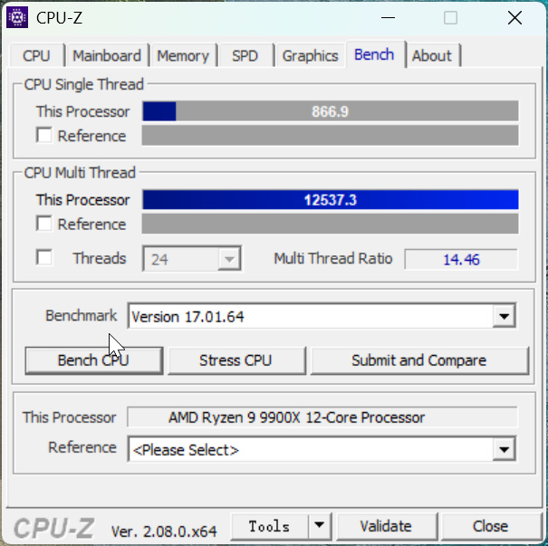 使用CPU-Z跑分,單核性能得分866.9,多核性能得分12537.3,相較於上一代R7 7950X,R9 9900X的單核性能有所提升,但多核性能還是要差一些。
