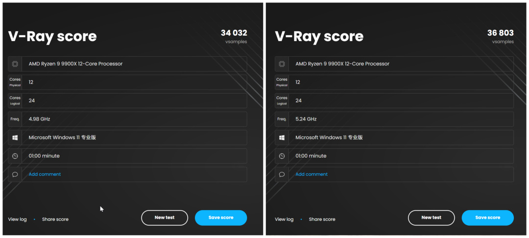 v-Ray渲染性能測試,開啓PBO前,得分34032,頻率4.98GHz;開啓PBO後得分36803,頻率5.24GHz。分數漲了2771分,提升幅度約8.14%,頻率增加0.26MHz,提升幅度約5.22%。
