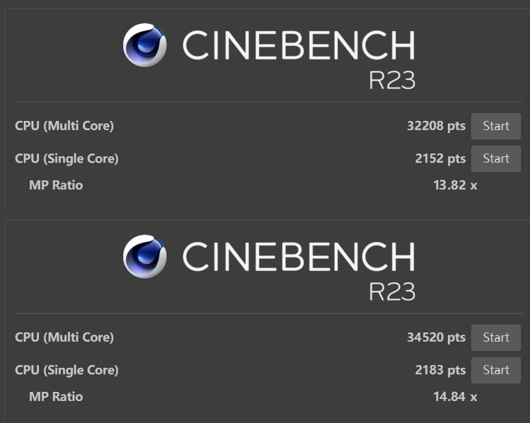 AMD增強版精準頻率提升(PBO) 可讓CPU電流和電壓達到自身界限情況下榨乾系統蘊藏的性能。在CINEBENCH R23測試中,開啓PBO前,多核得分32208,單核2152;開PBO後,多核得分34520,單核得分2183。多核性能提升7.2%左右,單核基本沒啥變化。