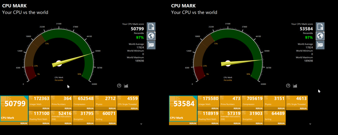 Performance Test:CPU MARK測試中,開啓PBO前得分50799,開啓PBO後得分53584,提升2785分,幅度5.5%。