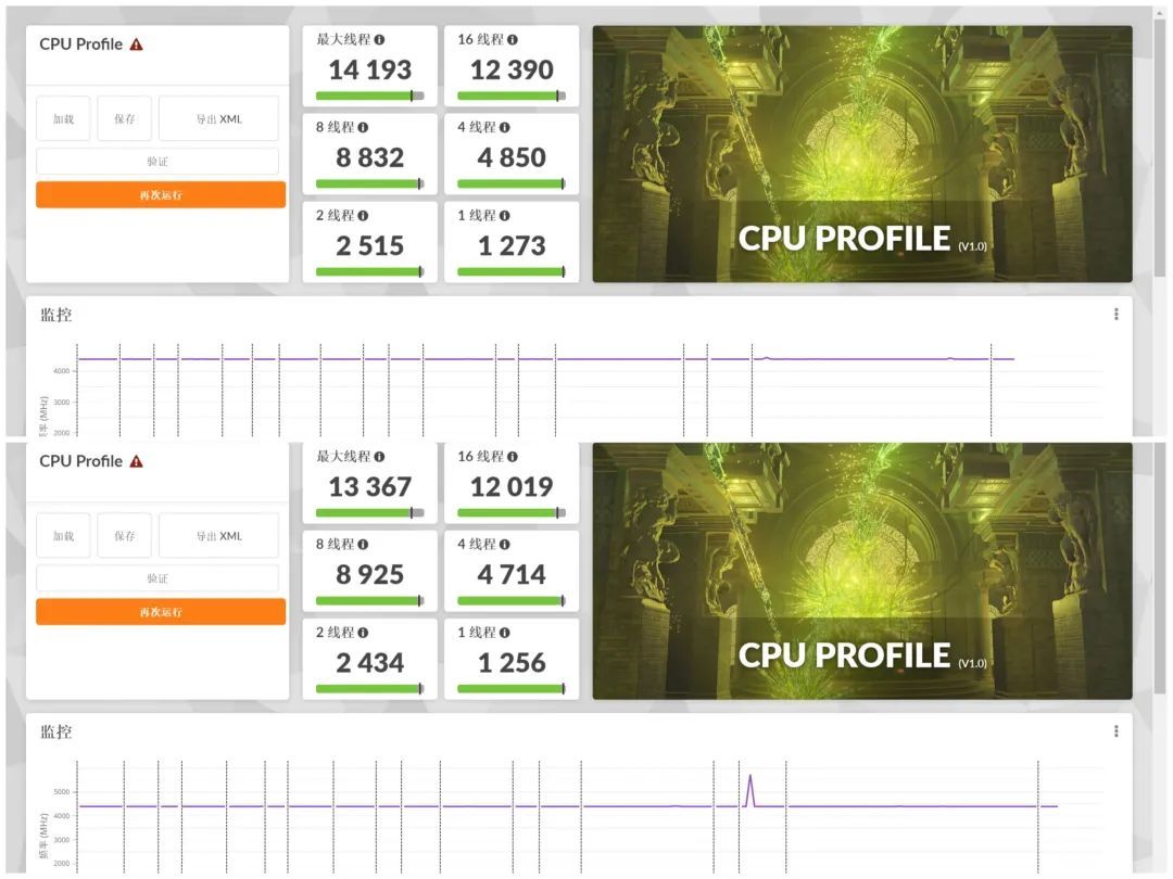 CPU Profle測試,上面是開PBO後,最大線程得分14193,下面是開PBO前,最大線程得分13367,提升826分,16線程下提升371分,8線程及以下變化不明顯。