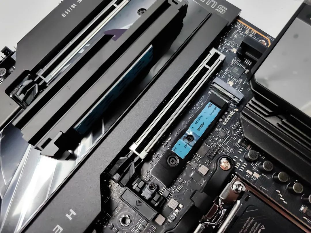 ROG X870HERO擁有兩條全長的PCIe x16插槽,均支持PCIe 5.0 x16模式,並且都進行了強化設計,同時保證足夠的強度。同時,這次ROG去掉顯卡快拆鍵,全新設計了隱藏式顯卡快拆裝置。只需從顯卡擋板處拔起,即可自動解鎖,非常簡單實用,也方便了小白上手操作。