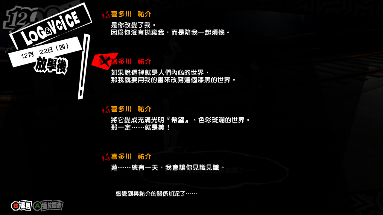 回到前面說的反抗精神。去年我曾經給一個朋友推薦過一個影視劇,在我眼中的神作在他眼裏卻是紕漏百出並且認爲很多問題只是提出並沒有完全意義上解決。只能說確實單元劇,肯定不可能揪着一個問題不放或者現場解答,但是我仍然覺得能提出問題或者拋出一個苗頭是一件非常重要的事,至少可以映射出一些問題,這就已經是難能可貴了,如果萬事都有別人去解答,那麼個人的思考應該置於何處呢。P5裏面也是很多問題拋出了,雖然很多是用了“take your heart”的方式令對方悔改並自述罪過,但是有些事提出來是一件可貴的事,而且很多事也可以放在現在來說。提及現代社會生活在當下的個人,抗爭仍然是一種力量,不從衆,保持獨立思考,進行個人的思考去發現答案,這亦是我們每個人的武器,用自己的思考去改變其他人的想法,亦是一種“take your heart”