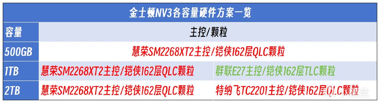 可以看到,只有选择1TB的金士顿NV3时,才有概率买到群联E27主控+TLC颗粒,而500GB和2TB的版本,使用的全都是QLC颗粒……