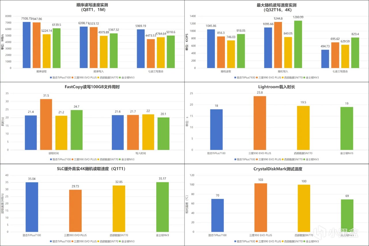 前几天闲来无事,搞来致态TiPlus7100、三星990 EVO Plus、西部数据SN770和金士顿NV3这四款1TB的SSD进行了横向对比测试,并且形成了一万来字的测试报告。