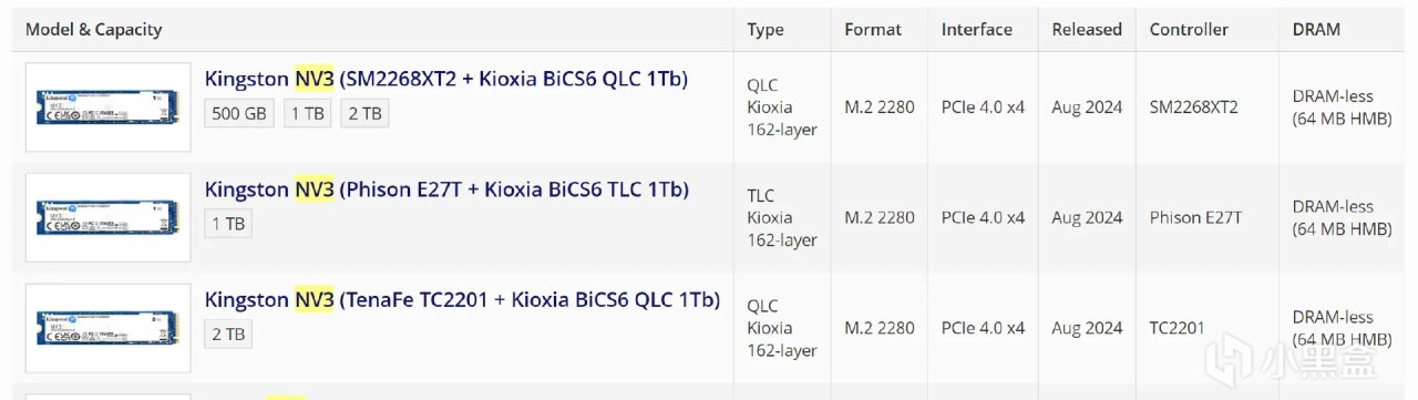 根据网友的提示,我在TECHPOWERUP网站上果然查到了金士顿NV3的几种主控颗粒方案,如下图所示(关于网友提到的,NV3部分批次也使用了YMTC X3-6070 QLC颗粒这个说法,我没查到信息来源):