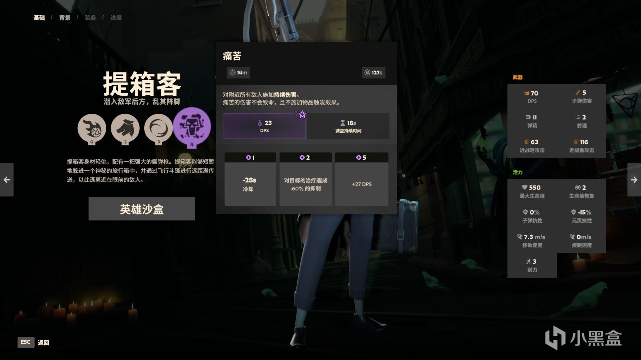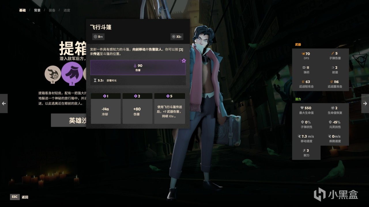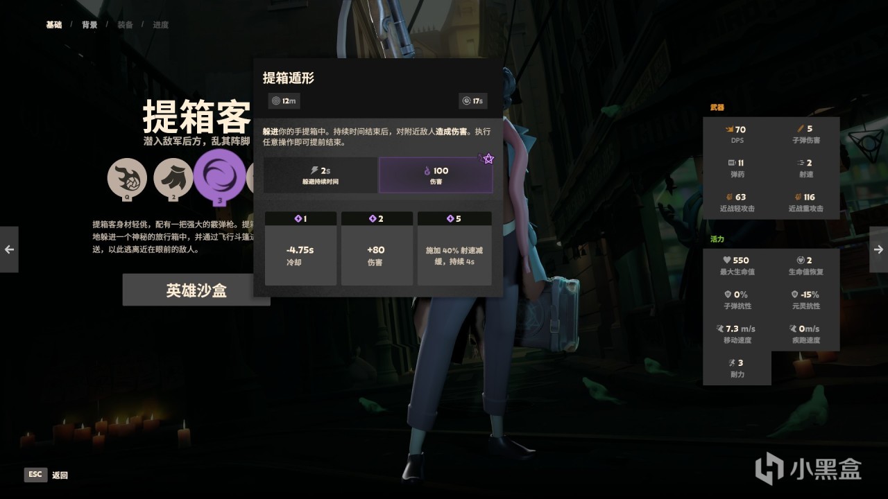 自身钻入手提箱中,免受一切效果,持续时间结束时或提前按空格键可以触发范围伤害,箱中执行任何操作会让此技能提前结束进行你的操作(如2技能传送,四技能,各种主动装备如冰天雪地等)