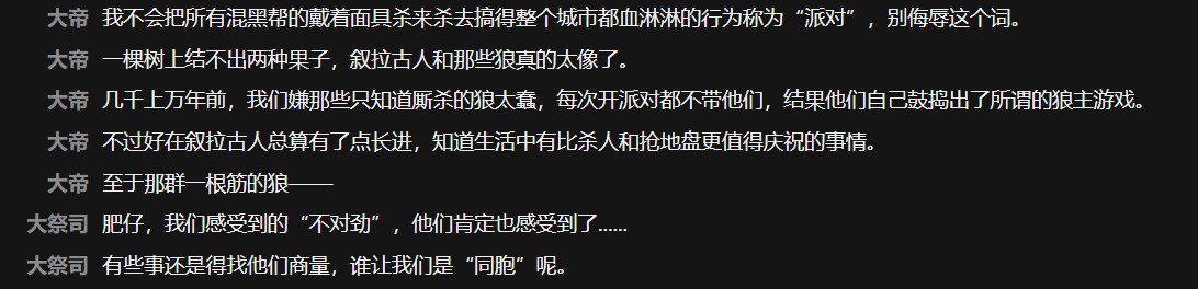 揭幕者们兽主的集会揭示了这点:原来是因为很久以前大帝、多利等兽主开PARTY不叫狼之主,结果人家自己在叙拉古搞起了狼人杀o(*≧▽≦)ツ