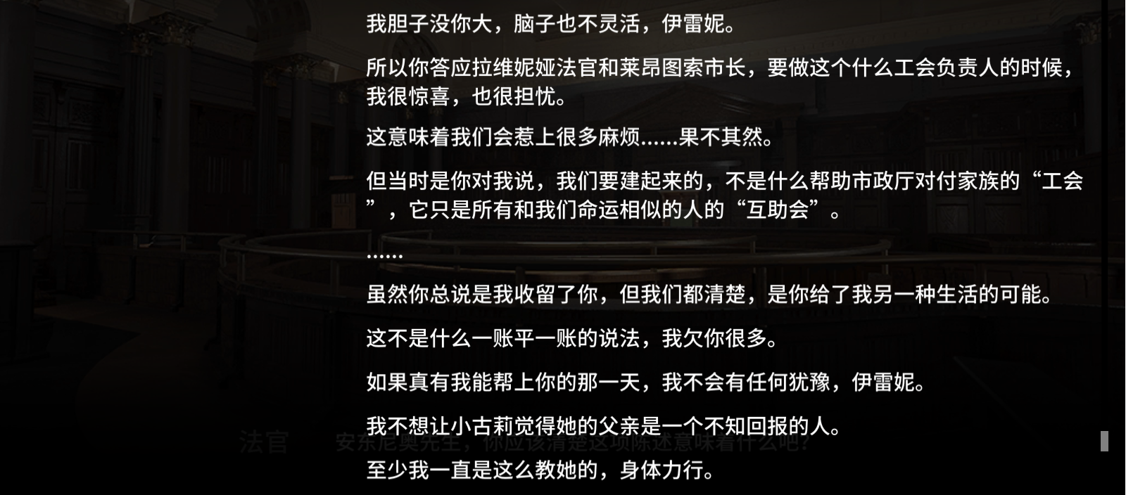 伊雷妮不能让索默尔毁了一切,她将索默尔打昏并打算告知拉维尼亚希望得到宽恕,可前往旁听的一场法庭判决让伊雷妮见识到了法律的冷酷与残缺