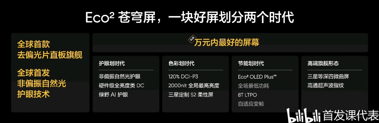 ◆ 屏幕:6.78 英寸 2780×1264 三星 Eco² OLED Plus 等深四微曲屏幕,定制 S2 发光材料,1-120Hz 刷新率,8T LTPO 电路,手动最高亮度 1000nit、全局激发亮度 2000nit、局部峰值亮度 6000nit;护眼方面支持非偏振自然光护眼、硬件级全亮度类 DC 调光,绿野 AI 护眼,支持 10bit 色深,高通超声波指纹识别方案,2600Hz 瞬时触控采样率;