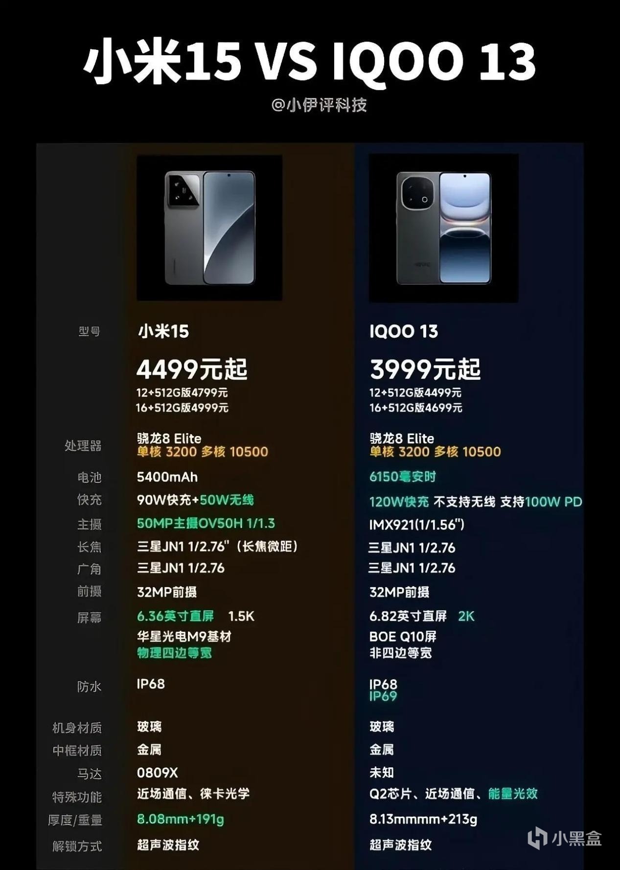 12GB+256GB 小米15售價4499, iQOO13售價3999,便宜500