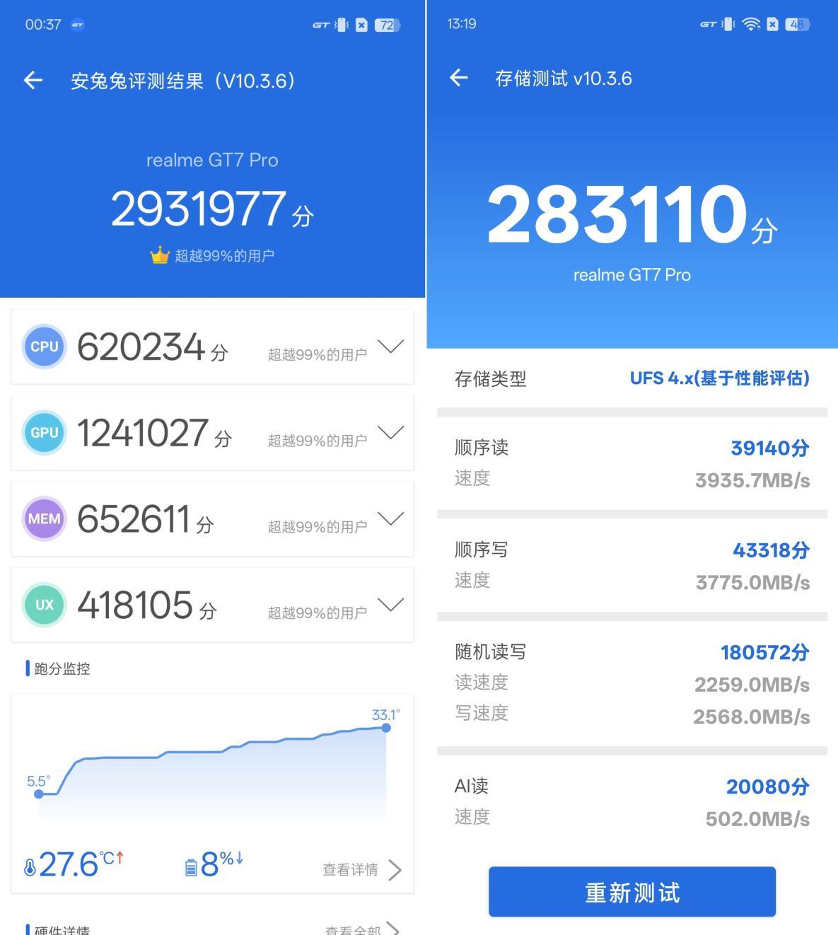 在安兔兔V10版本中,真我GT7 Pro得分2931977分,其中CPU得分620234分;GPU得分1241027分;MEM得分652611分;UX得分418105分。