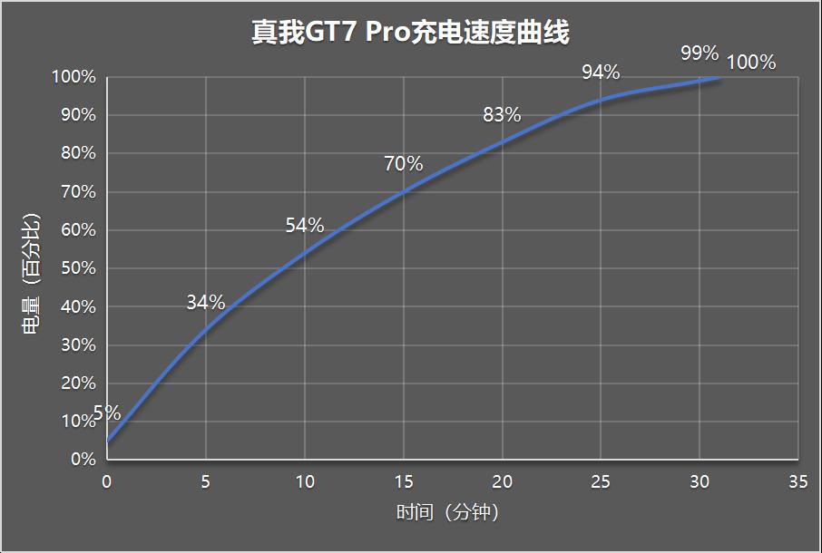 真我GT7 Pro開始充電10分鐘,電量就已經來到了57%;之後功率逐步放緩,在15分鐘充電70%;25分鐘充電94%,最後於31分鐘徹底充滿。