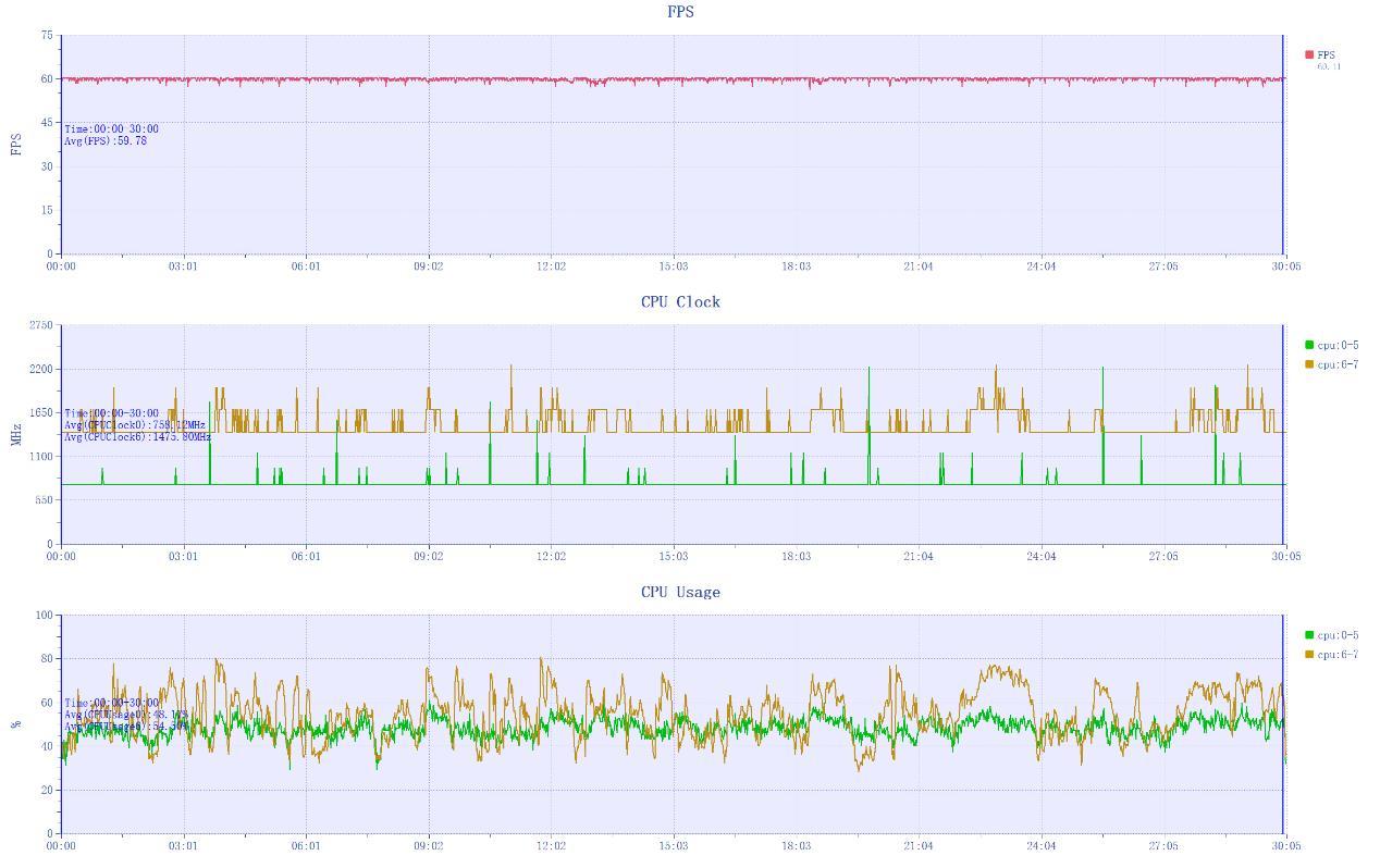 30分鐘測試結束後,真我GT7 Pro運行《崩壞:星穹鐵道》平均幀率爲59.78幀,中間出現了數次幅度較小,但持續時間略長的幀數波動,不過整體表現依然算得上穩定。