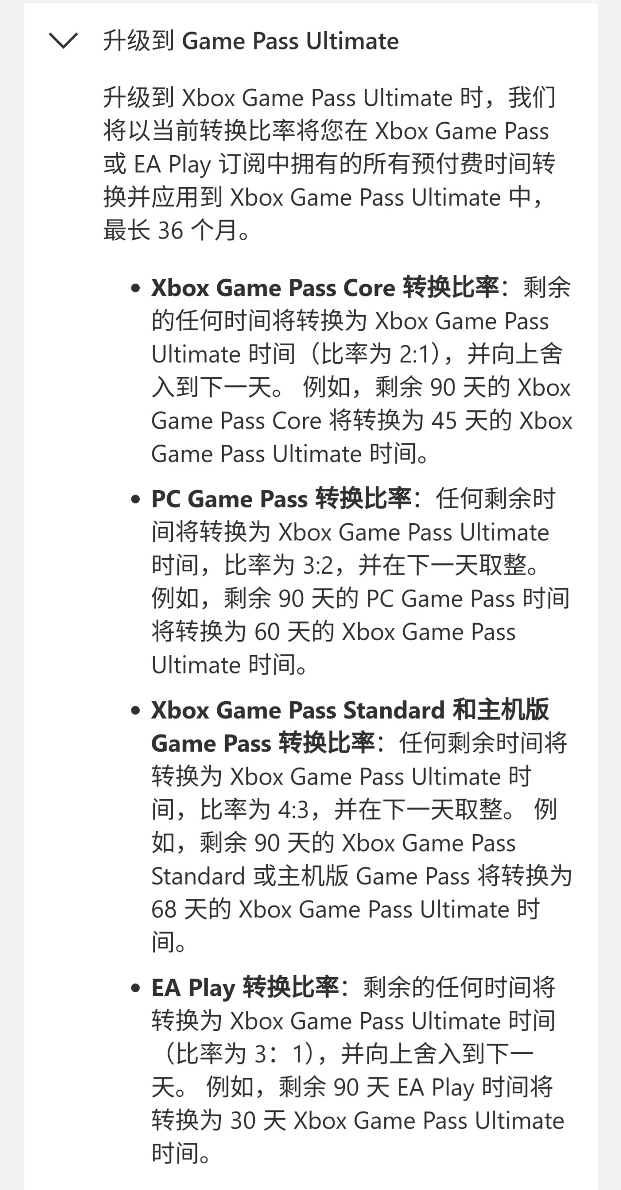根据目前的转换政策,XGP CORE与XGPU的转换比例为2:1,最长可兑换36个月,相当于三年的XGP CORE能升级为一年半的XGPU