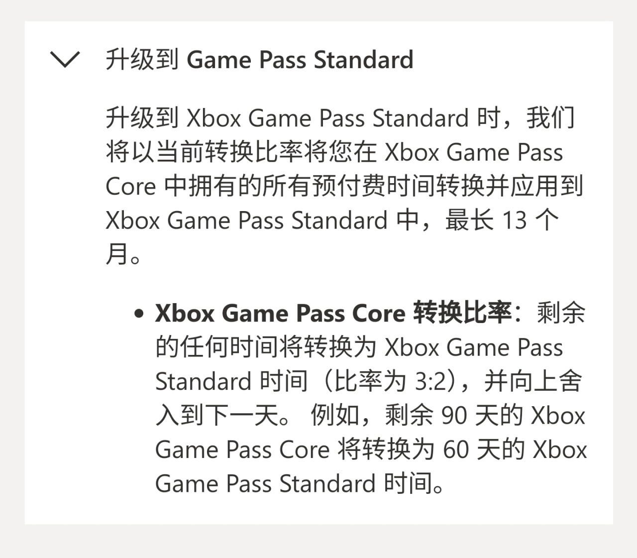 XGP CORE与XGP STANDARD标准版的转换比例为3:2,相当于三年的XGP CORE能升级为两年的XGP标准版,但最多13个月,所以三年并兑换不完。