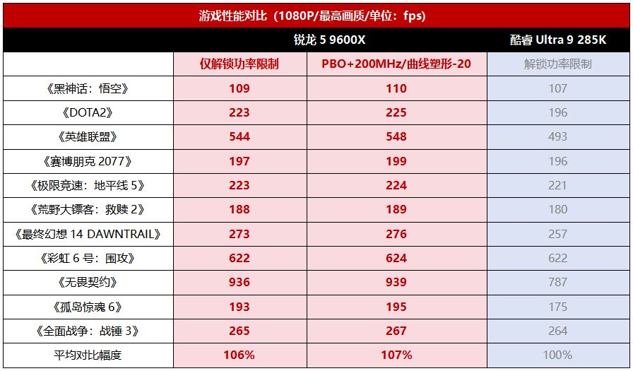 遊戲測試:銳龍5 9600X默頻也能超越酷睿Ultra 9 285K