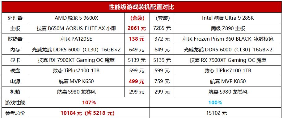 從前面的測試可以看到,銳龍5 9600X在絕對的遊戲性能方面已經完勝了酷睿Ultra 9 285K這款新旗艦,對於追求更好遊戲性能的主流裝機玩家來講,很顯然可以選擇價格僅爲1649元的銳龍5 9600X來節約大筆的裝機預算了。所以有時候價格高並不一定意味着就能提供更好的體驗,要從實際出發比較纔行。此外,由於銳龍5 9600X搭配的AM5平臺相對剛上市的Z890平臺也有明顯價格優勢,同時它對散熱器和電源的要求也更低,所以從配置表中也可以看到銳龍5 9600X整機的價格也更有優勢,相對酷睿Ultra 9 285K整機節約了5218元之多。銳龍5 9600X擁有更好的遊戲性能,更低的裝機價格,想必各位主流遊戲裝機玩家已經知道該怎麼選了。
