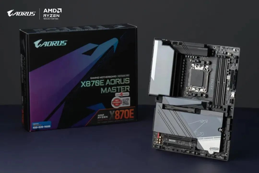 本次測試使用了來自技嘉的X870E AORUS MASTER超級雕。它配備了16(110A)+2(80A)+2相供電和超大的VRM散熱裝甲,散熱裝甲內置熱管與高品質導熱墊。內存部分,主板配備了全新的AORUS AI SNATCH Bullet Point(AI超頻法寶)技術,支持DDR5內存一鍵自動提速,同時也擁有技嘉D5黑科技,可以一鍵提升內存帶寬,提供更流暢的使用體驗。