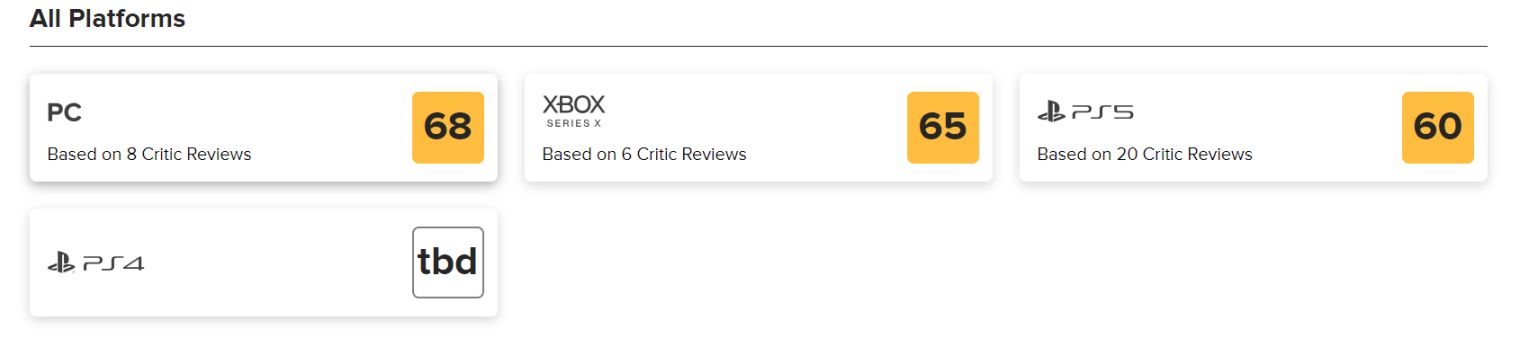 Metacritic(PS5端收錄20家媒體評分,Metascore 60分;Xbox端收錄6家媒體評分,Metascore 65分;PC端收錄8家媒體評分,Metascore 68分)
