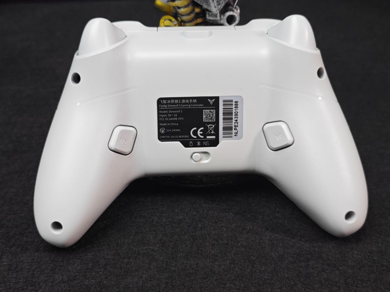 手柄背面的握把防滑点阵也是做得比较深,带来了更加出色的防滑性能。除此之外,背面的设计与冰原狼2一致:2颗支持宏的机械开关背键,三模切换开关。