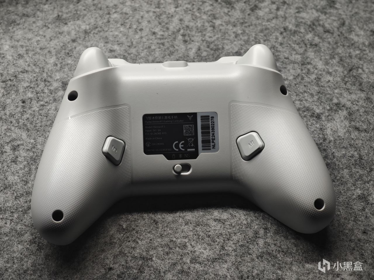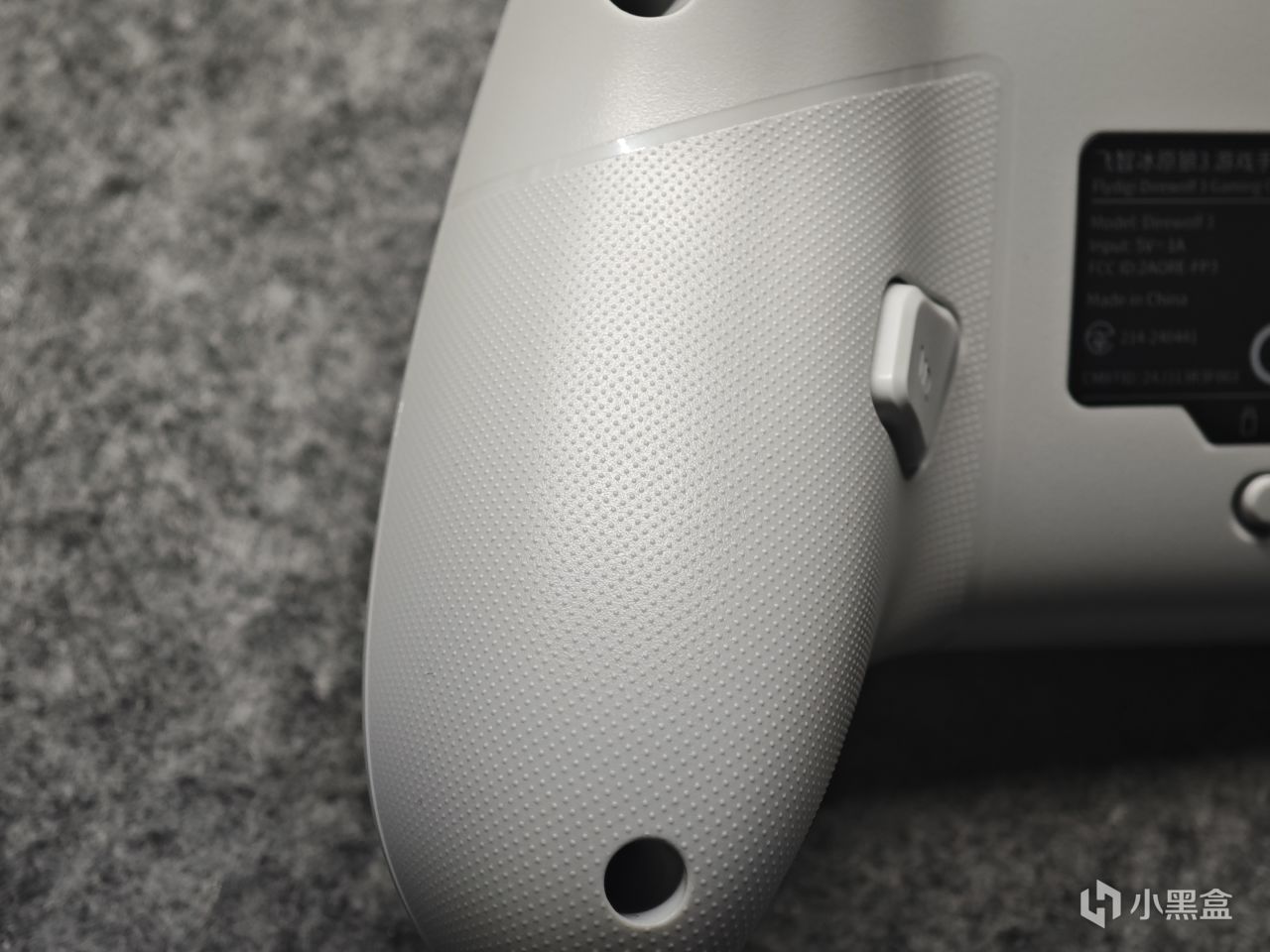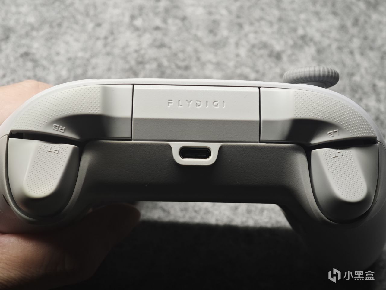 手柄的顶部有个飞智的logo,没有手机支架槽位。肩键是导电胶按键,扳机是霍尔扳机,无扳机锁。