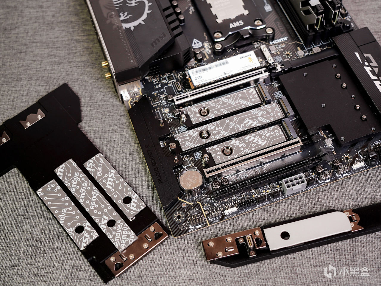▼拆除散热片后可以看到主板配备了4个M2 接口,上面两个接口直连CPU,支持PCIe 5.0 x 4,使用第二接口时第一条PCIe插槽的速度会变为PCIe 5.0 x 8;下面两个由芯片组提供,支持PCIe 4.0 x 4,另外所有SSD的拆装也都采用快拆装设计。