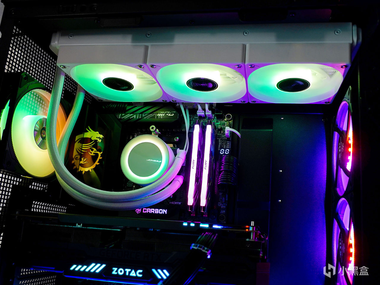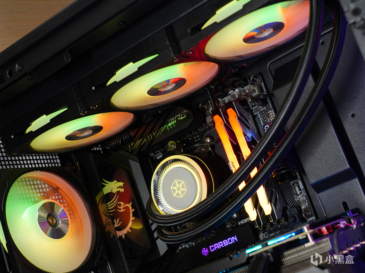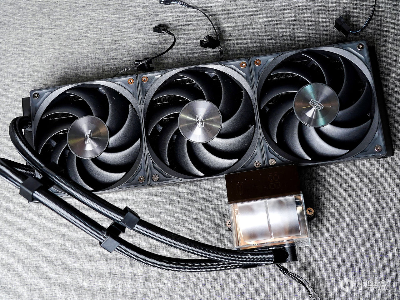 ▼装机效果如下,冷头一部分是透明亚克力壳,内部周边有ARGB灯带;风扇主打性能,无光效,在水冷组中,其风扇转速,风量和风压都是最强的。